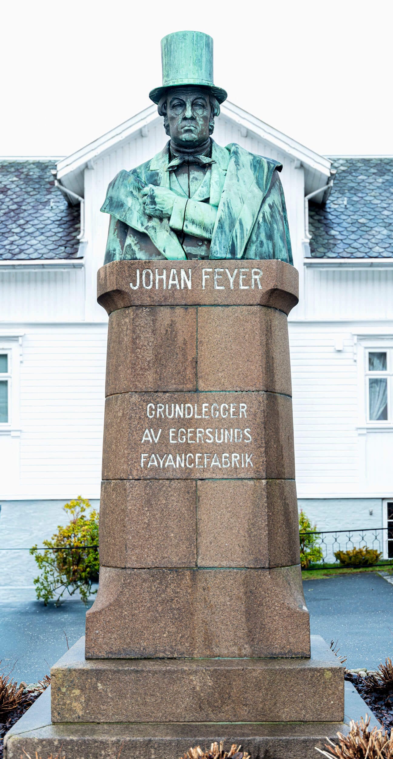 Utenfor den gamle fayancefabrikken, som i dag huser ALTI Eikunda, står en byste av Johan Feyer. I 1901 bestemte formannskapet i kommunen at tiden var inne for å få reist et minnesmerke over Johan Feyer, grunnleggeren av Egersund Fayancefabrik. Det ble oppnevnt en komité som skulle arbeide med saken. Nødvendige midler ble skaffet til veie, og i 1906 var en byste ferdig modellert. Den var utført av billedhuggeren Jo Visdal (1861 – 1923). Bysten ble avduket på Tothry 23. september 1906. Der sto den til 1936, da den ble flyttet til sin nåværende plassering på Fabrikkplassen.