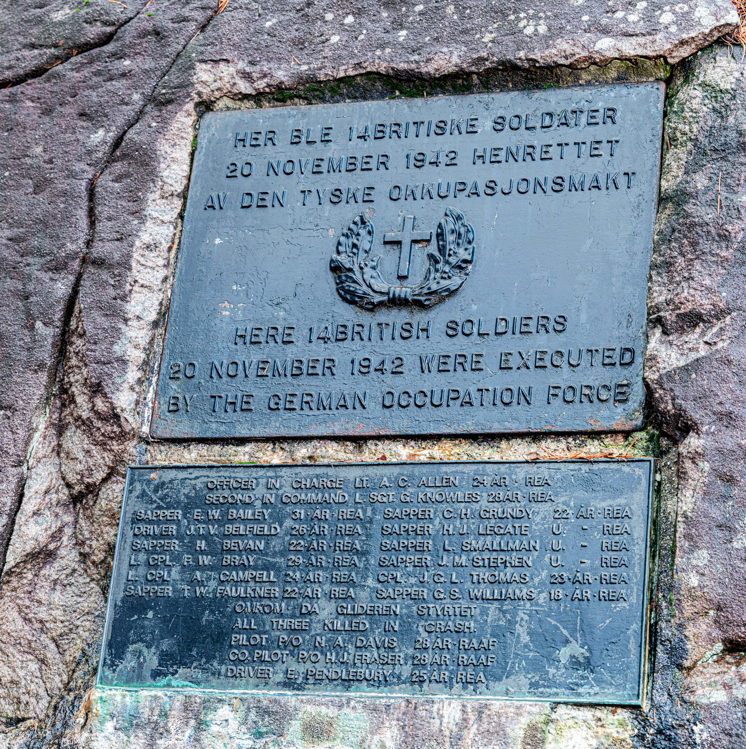 On the initiative of the Egersund and Dalane Defence Association, a plaque commemorating the 14 British soldiers who were executed was unveiled on 9 November 1957. However, the memorial plaque is not set up exactly where the executions took place, most likely because the exact location of the place of execution was not known at the time. On the memorial plaque, the number of soldiers executed was initially stated as 11, but the correct number is 14. This has now been corrected. In 1990, a name plate was erected that also lists the names of the three people in the glider who died in the crash.