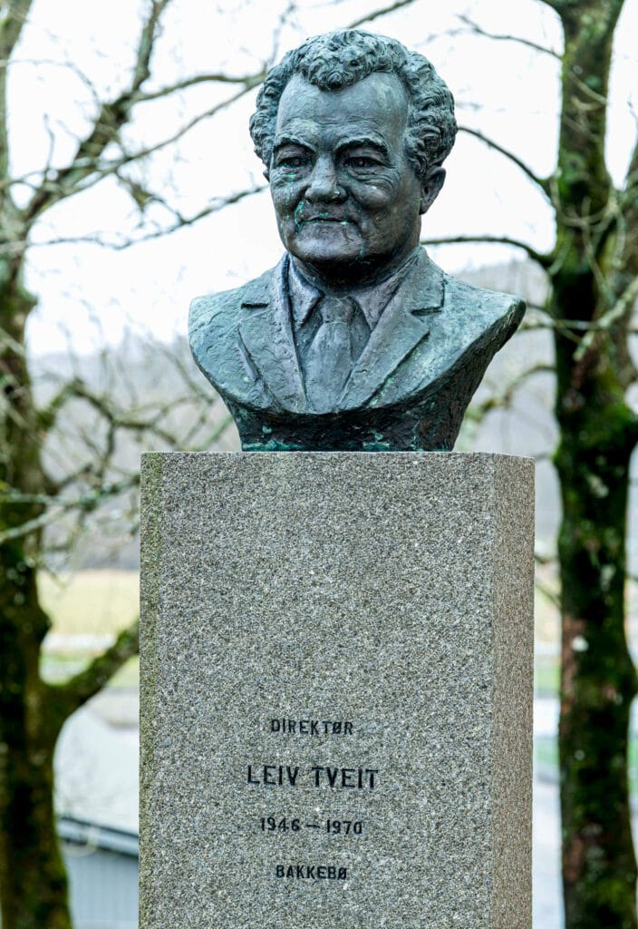 A bust of Bakkebø's first manager, Leiv Tveit, placed at Bakkebø church. The bust was created by sculptor Emma Matthiasen and was unveiled by Bakkebø's long-time driver, Jens Tønnessen, on 26 October 1970.