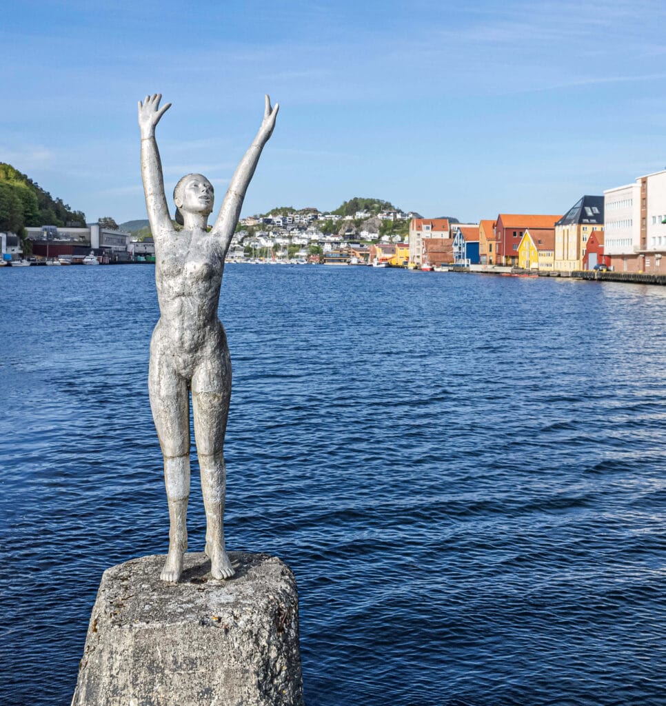 Many boaters already know her. Stretching gracefully in aluminium, with her back to the city and her eyes turned towards the sea, she welcomes seafarers to Egersund. Is she a woman emerging from the depths? Or a sensual figure luring you in? Artist Hannu T. Konttinen leaves it up to the imagination. The sculpture is located in Lindøygapet, and was unveiled on 29 July 2000 during Kyststevnet with great festivities.