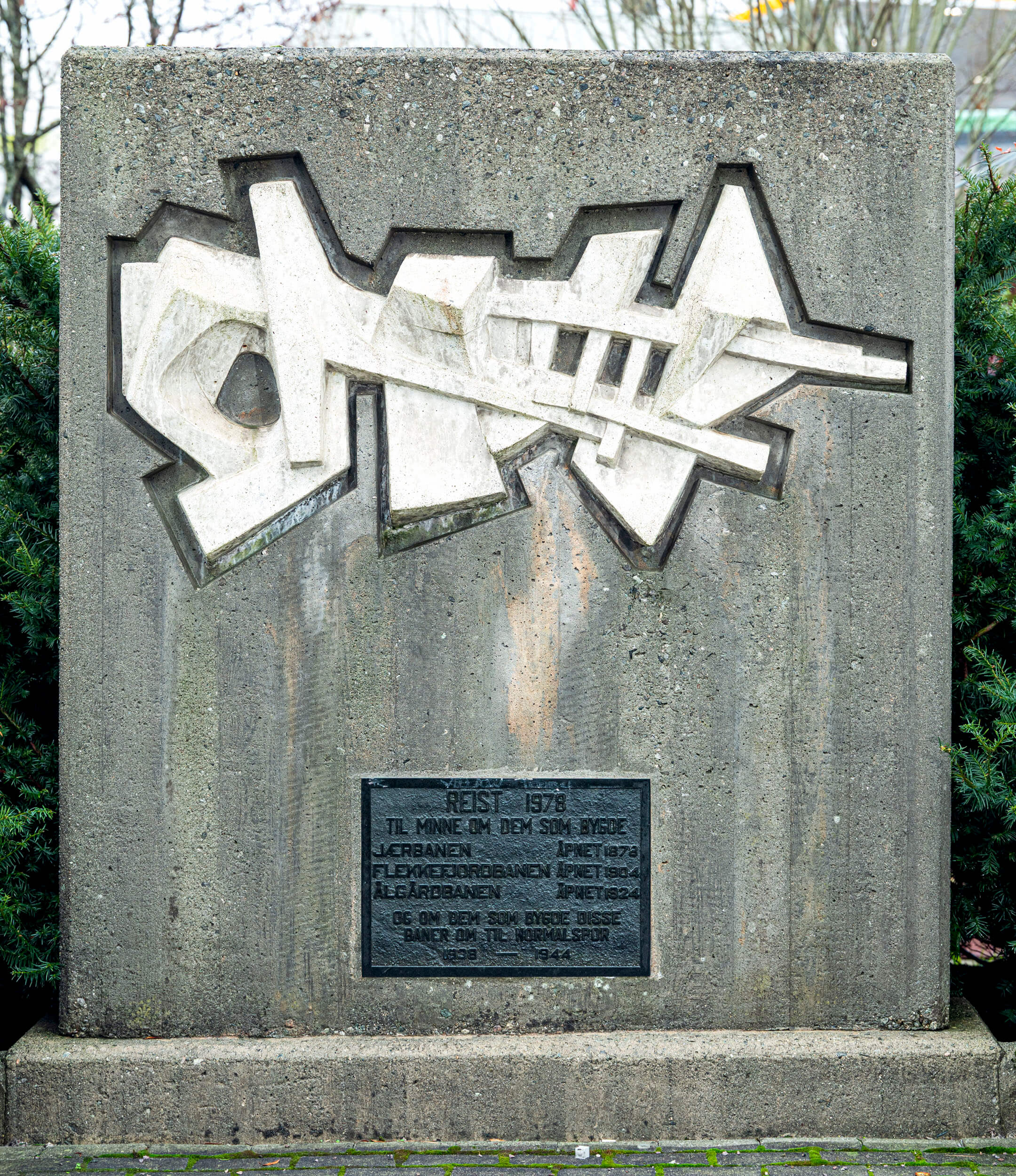 The memorial is a relief that symbolises the railway line cutting through the various obstacles. It was erected by NSB, and was placed at Egersund station when it was located roughly in the centre of the former Stavanger railway district. It was created by sculptor Hugo Wathne and was unveiled by Mayor Bjørn Bårdsen on 28 December 1978.