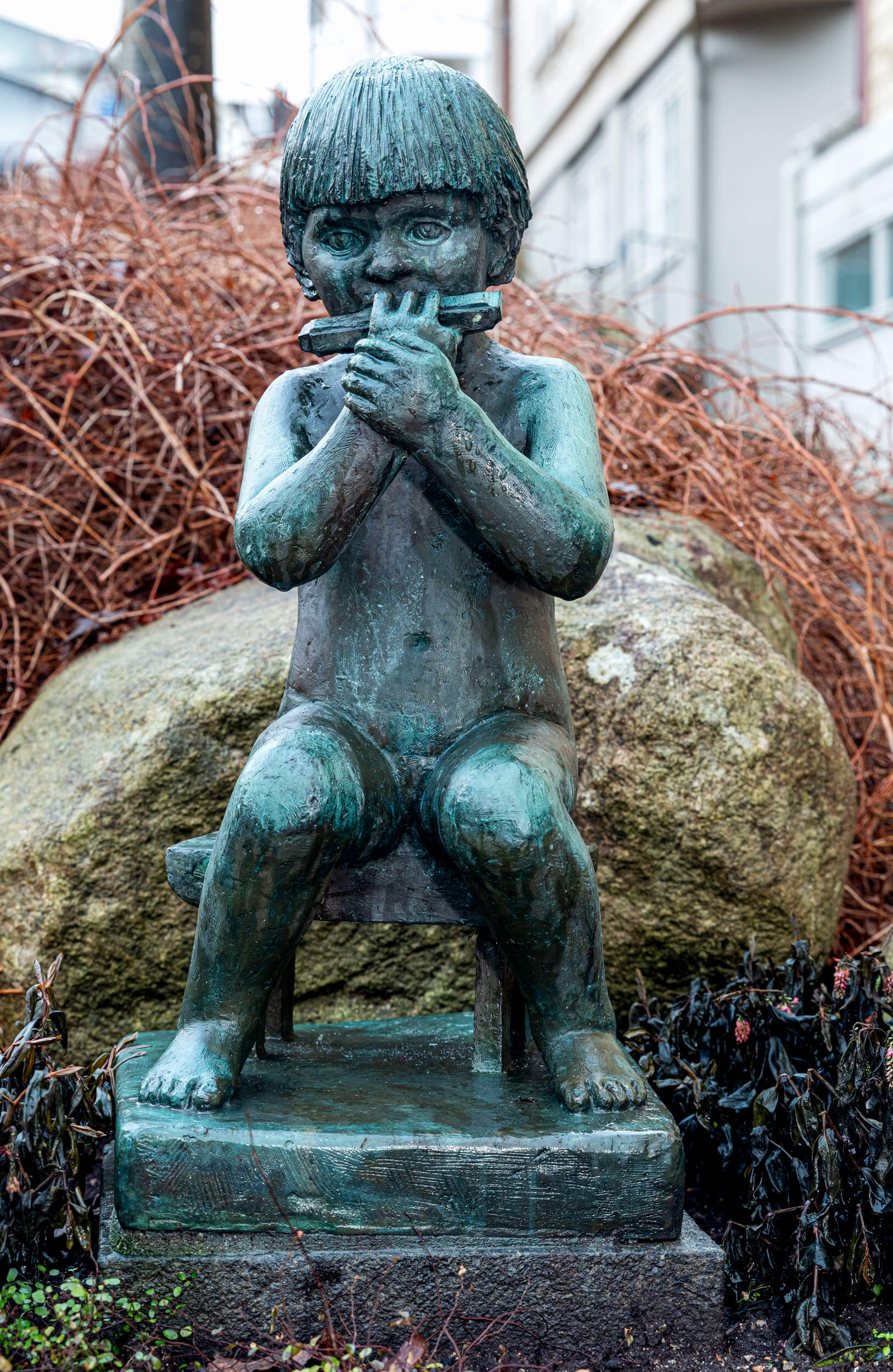 The bronze sculpture stands at the foot of Lerviksbakken. It was created by Kjell Grette Christensen and depicts a girl with a harmonica.
