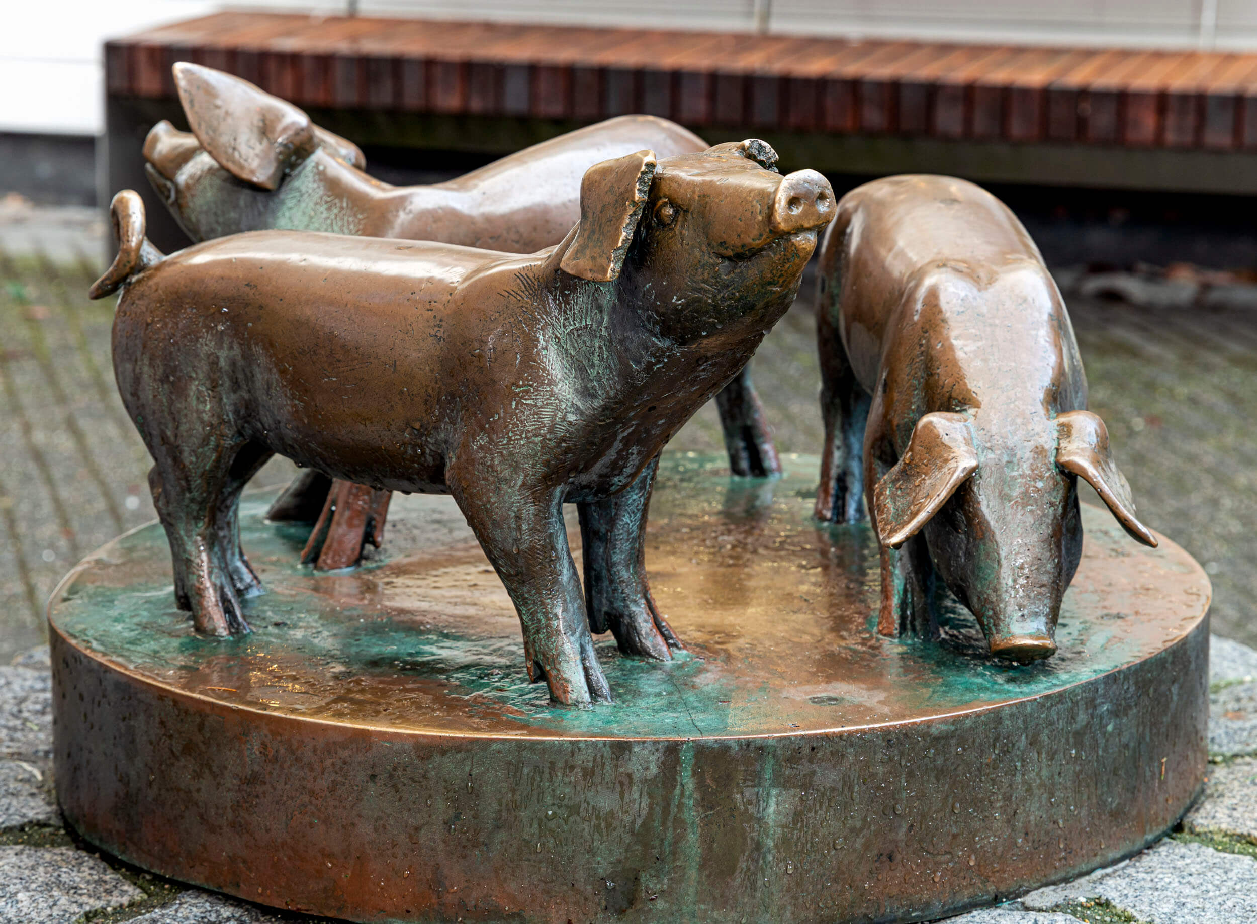 Plassen i krysset mellom Storgaten og Kirkegaten, i sentrum av Egersund, kalles Grisatorget. Navnet kommer av at det var her tidligere tiders handel med smågriser fant sted. Skulpturen av Three little pigs standing in the square is a reminder of this. It is designed by Skule Waksvik. If you're curious about more details about Grisatorget, you can read this article from Kulturstien in Egersund.