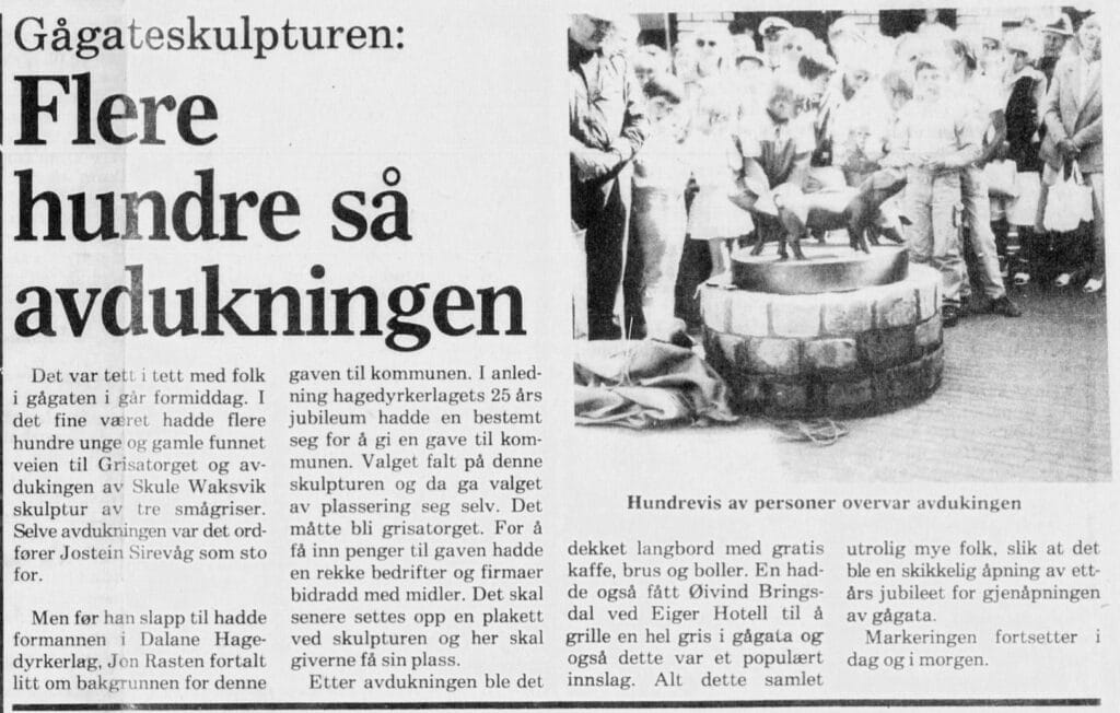 Grisatorget is so named because this is where the piglet trade used to take place. The sculpture "Three little pigs" was unveiled here on 5 July 1984 and was created by Skule Waksvik. The unveiling was followed by a barbecue of whole pigs in Storgaten.