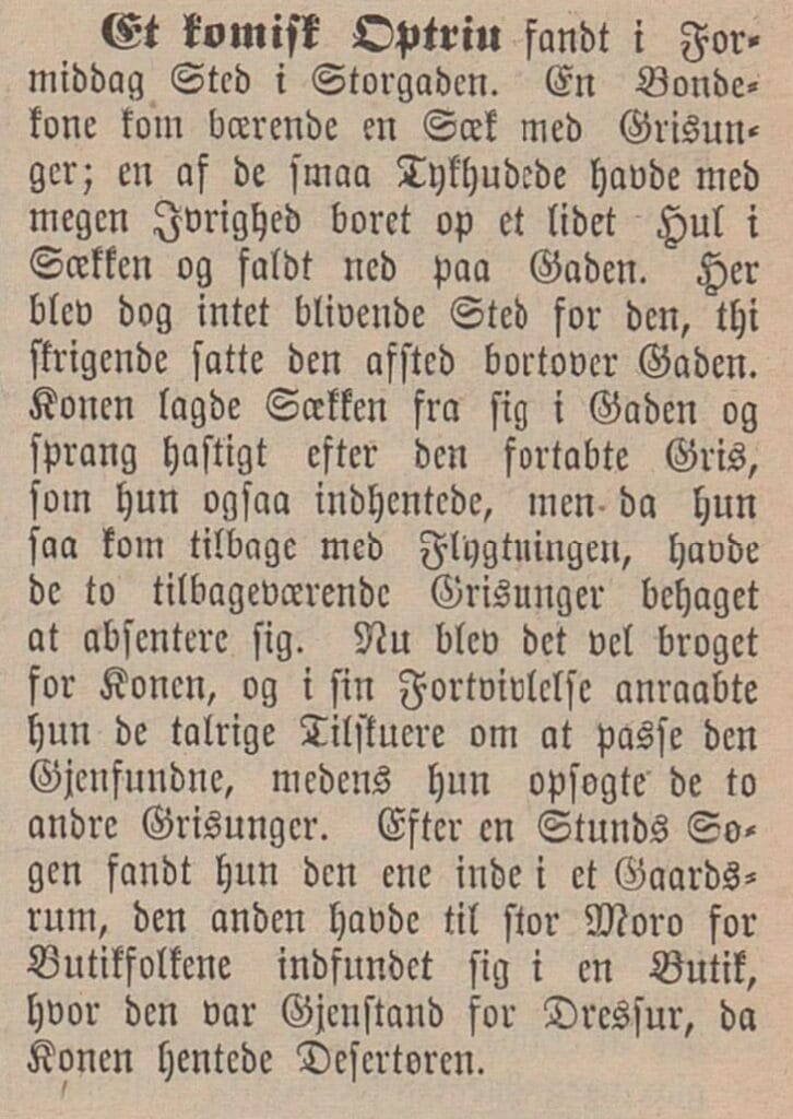 "A comical scene took place this morning in the main street. A farmer's wife came carrying a sack of piglets; one of the little thick-skinned ones had drilled a small hole in the sack with great eagerness and fell into the street. There was, however, no permanent place for it, for screaming it set off across the street. The wife put the sack down in the street and ran hastily after the lost pig, which she also caught up, but when she returned with the fugitive, the two remaining piglets had conveniently absented themselves. Things were now getting a little confused for the wife, and in her despair she asked the numerous onlookers to look after the fugitive while she searched for the other two piglets. After an hour's search she found one in a yard, and the other, to the great amusement of the shopkeepers, had found its way into a shop, where it was being trained when the wife fetched the deserter."