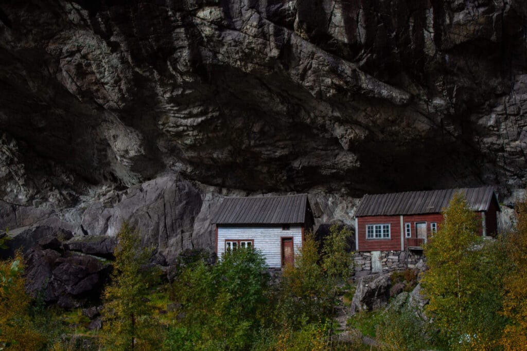 Only a few minutes' walk down from the viewing platform are: The houses under the "Helleren" at the very heart of the fjord. The pit is 10 m deep and 60 m long. The houses are several hundred years old and stand on protected land. The archaeologists have found remains of people who lived here over 6,000 years ago. The houses are open to visitors and it is important that great care and respect for the place is shown.