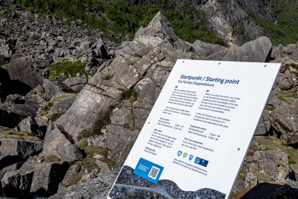 Complete equipment with safety harness and helmet can be rented from Veen Gardscamping or Byrkjedalstunet. It is not permitted to climb the Via Ferrata without approved equipment.