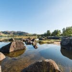 The idyllic bathing area is perfect for the whole family of all sizes, especially those with small children. Shallow fresh water and small, cosy beaches create a peaceful atmosphere for young and old alike. For the teenagers in the family, there is a pool where you can dive and snorkel. If you're lucky, you'll see freshwater fish swimming around in the water.
