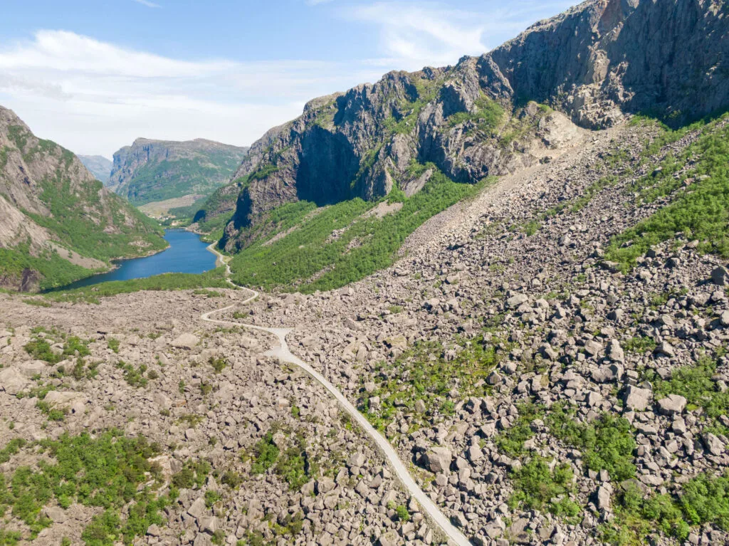 Major natural events shaped Gloppedalsura, located in a valley with two lakes surrounded by dramatic mountains. The valley witnessed the forces of glaciers and a large landslide that occurred several thousand years ago in Gloppedal.During World War II, the valley saw heavy fighting. The unique landscape of Gloppedalen played a crucial role for Norwegian soldiers defending this area during the war. The scree slope, with its enormous boulders, passages, and hiding spots, served as a defensive position for Norwegian forces battling German soldiers here in April 1940.
