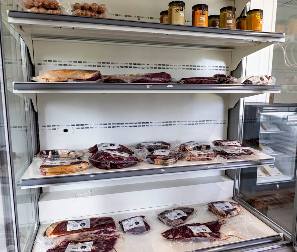 Eggs, cheese, jam, honey, cakes, meat, sausages and burgers are just some of what Løyning Gård has in the farm shop.