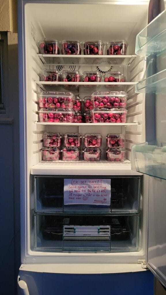 The farm sale is self-service, in a labelled fridge. Fruit is preferably paid for with Vipps, but cash is also possible! The sales periods are announced online.