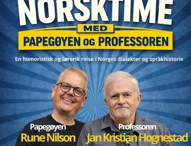 Ekstra norsktime med Papegøyen & ProfessorenI september 2025 inviterte papegøyen og professoren til en norsktime utenom det vanlige på en utsolgt Grand Scene i Egersund. Etter utallige oppfordringer fra publikum blir det nå ekstratime i kulturhuset. Samme pensum, men i nytt klasserom.Papegøye, humorist og musikant Rune Nilson og professor emeritus Jan Kristian Hognestad er begge to egersundere som er levende opptatt av språk, men med svært ulik tilnærming.Rune har reist land og strand rundt med sin prisvinnende dialektreise og snakket seg gjennom landet utallige ganger, mens Jan Kristian har opplyst folket både som universitetsprofessor, foredragsholder og som fast språkekspert i NRK P2 i over 25 år. Der papegøyen hermer og tøyser med dialekter, er professoren kunnskapsrik og grundig. Og i denne helt spesielle norsktimen kombinerer de sine kunnskaper og talenter i en humoristisk og lærerik reise gjennom Norges dialekter og språkhistorie. Hvem skulle tro at norsk språk kunne være så gøy?