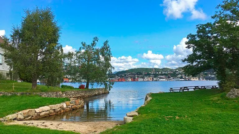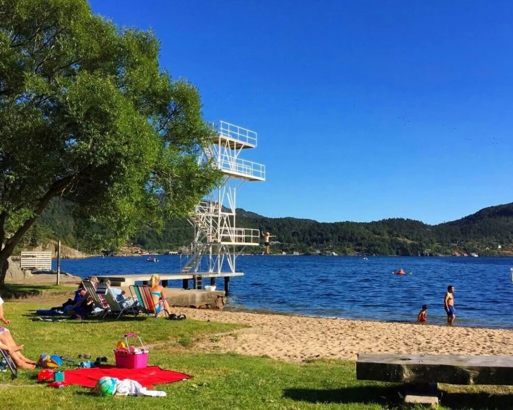 Populær og idyllisk, liten sandstrand med bryggeanlegg, gressplen med benker, stor grill med tak-overbygg og nydelig utsikt mot sentrum. HC-toalett og gode parkeringsmuligheter.