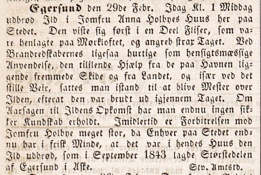 Anna Holbye er kjent i Egersund for å ha vært eier av huset hvor den store bybrannen i 1843 startet. På grunn av tett trehusbebyggelse og vind, brant to tredeler av byen ned. Hele området mellom Torget og Bradbenken brant ned, og hundrevis av mennesker ble husløse. Bybrannen i 1843 er den største av seks kjente bybranner i Egersund.