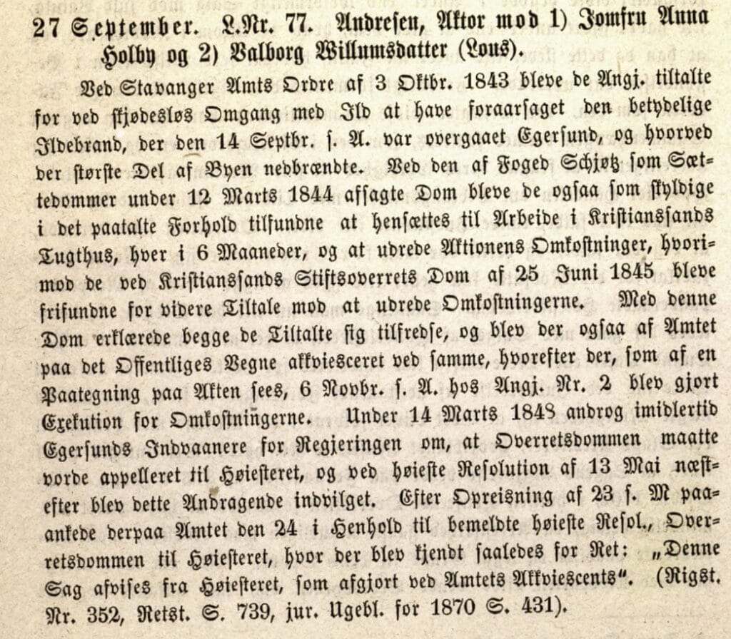 Mindre kjent er at det i 1848, bare fire år og fem måneder seinere, oppstod enda en brann i hennes hus i Egersund. Etter dette var visstnok forbitrelsen mot henne stor i Egersund, og kanskje var det derfor hun like etterpå flyttet til Kristiania (Oslo), hvor hun 23. mai 1849 startet en pikeskole.