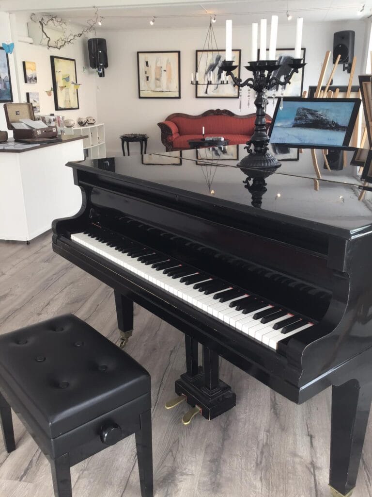 Kunstner- og musikerparet, Jack og Marit, ønsker at Galleri M skal være et sted som det går an å stikke innom for å nyte kunst sammen med musikk. – Det var litt jobb å få fraktet å få på plass flygelet vi kjøpte i Sandefjord, men nå står det klart og vi planlegger noen minikonserter i kunstlokalet, avslører Bjørkhaug.