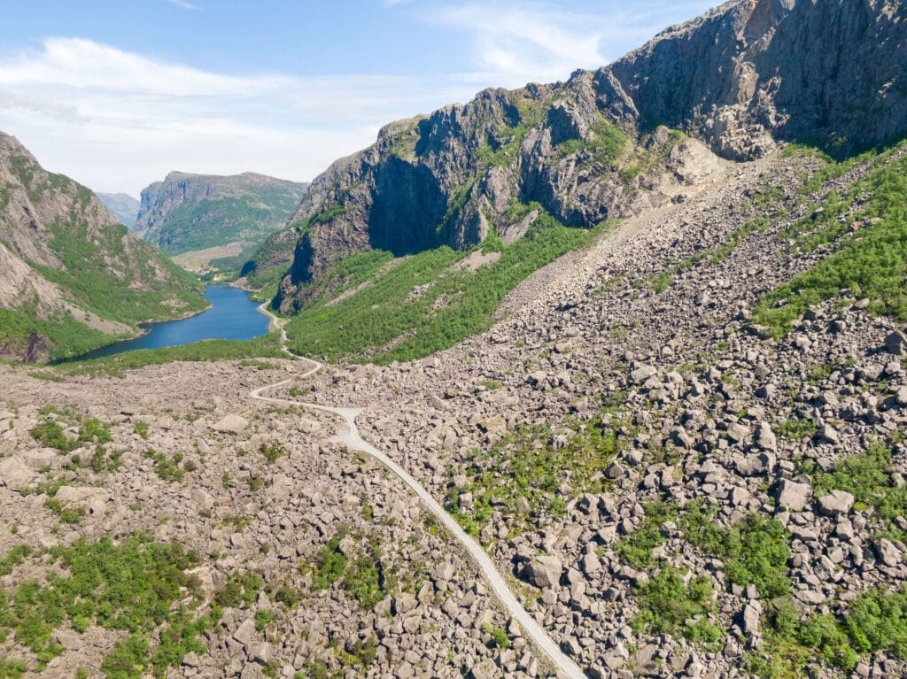 Mot slutten av den siste istiden begynte en isbre i Gloppedalen å smelte, og materialet som ble båret av isen dannet en morenerygg. Denne morenen dammet opp elva i dalen og vannet kunne ikke strømme fritt sydover mot Vikeså. En innsjø utviklet seg på Byrkjedal, 240 meter over havet, for ca. 10.000 år siden. En stund etter at moreneryggen ble dannet, gikk det et stort ras fra de høye klippene på sørsiden i Gloppedalen. Steinblokker på størrelse med hus løsnet fra fjellsidene og danne store hauger med vinklede, grove steinblokker på toppen av morenen.