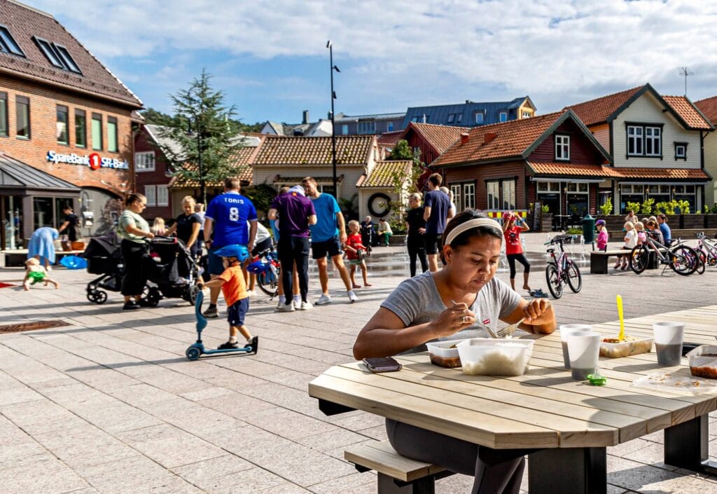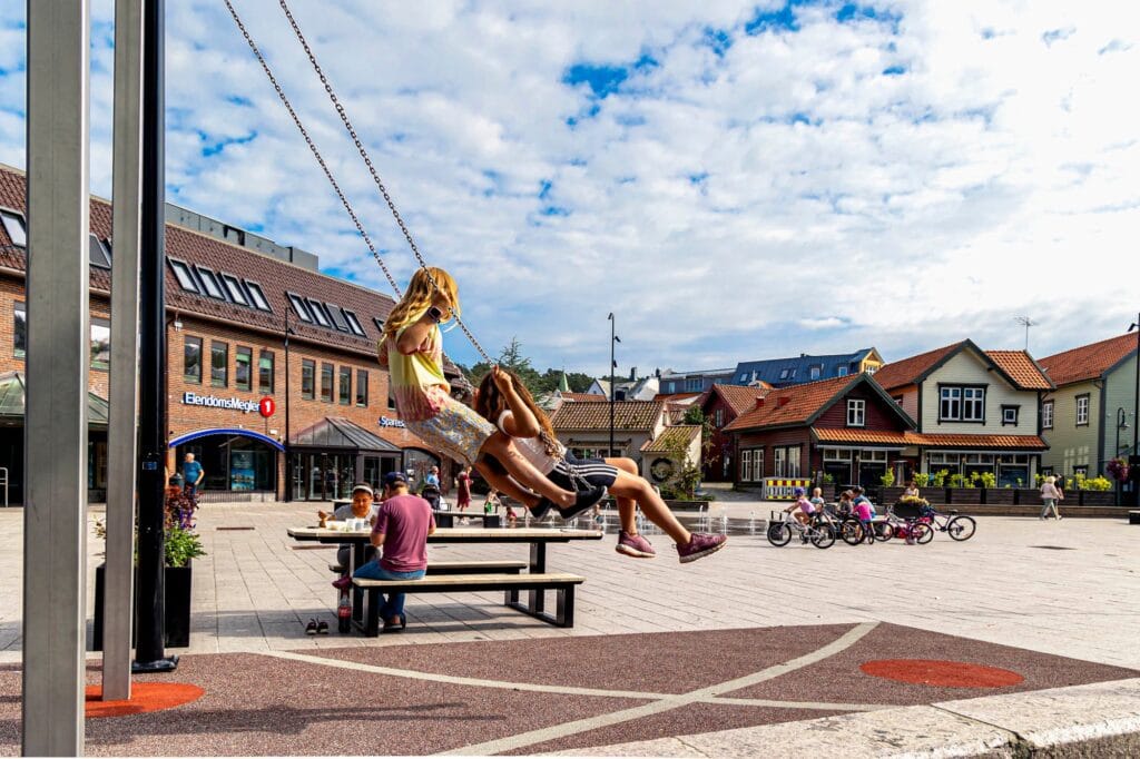 Månetorget er blitt et naturlig møtested for mennesker i alle aldre. Her møtes barn, ungdom og voksne – for en is, en kopp kaffe, en prat eller en pause i sola. Torget fungerer like godt under store arrangementer som Julebyen Egersund, som på en vanlig tirsdag formiddag.