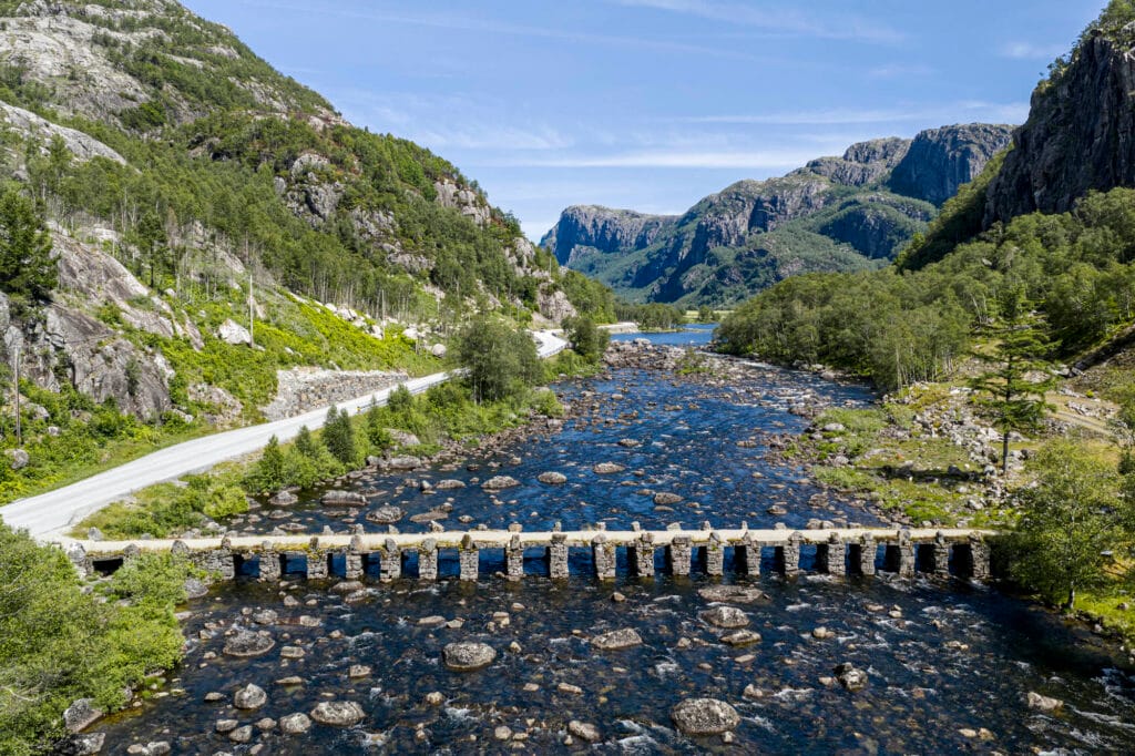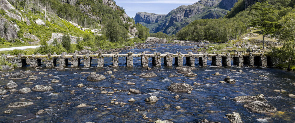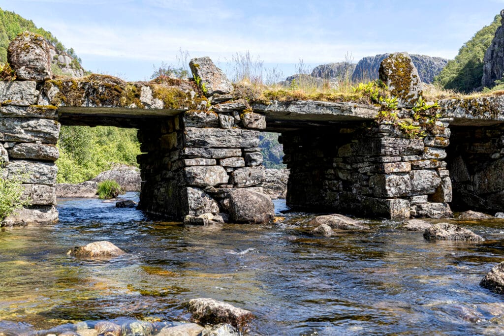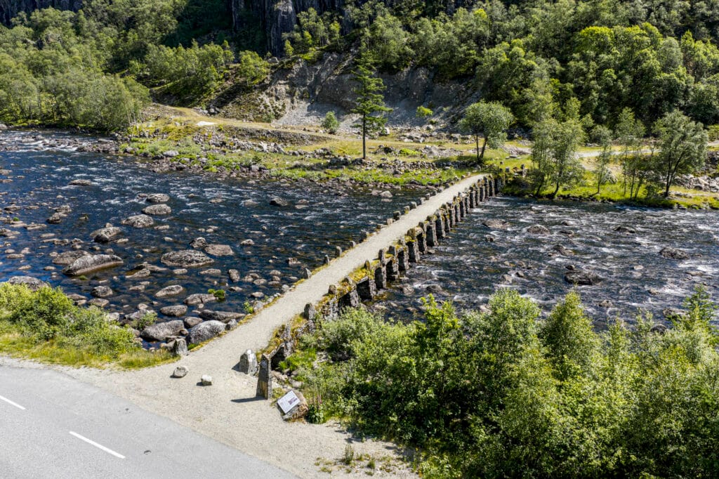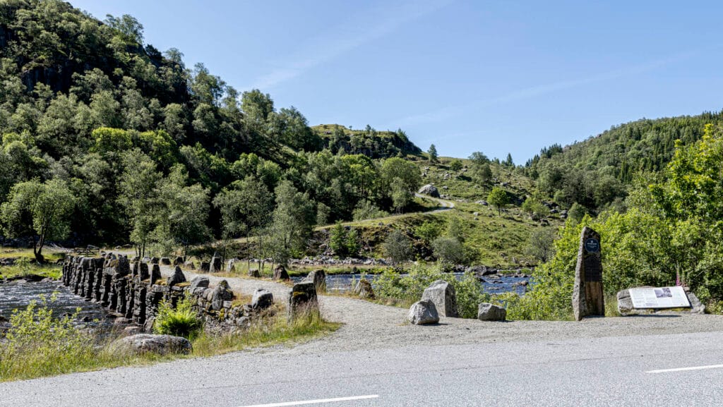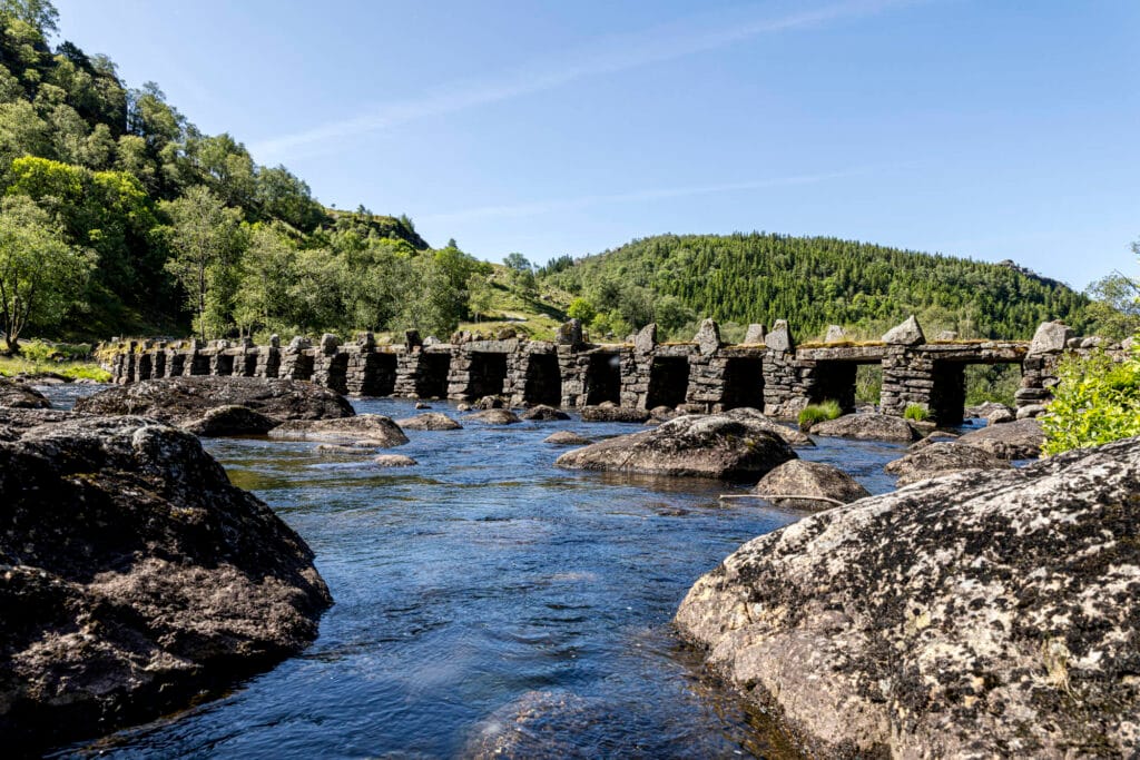 Denne 60 meter lange steinbroen er Nordens største og best bevarte i sitt slag. Med sine 21 lysåpninger med steinheller over er den et imponerende syn.